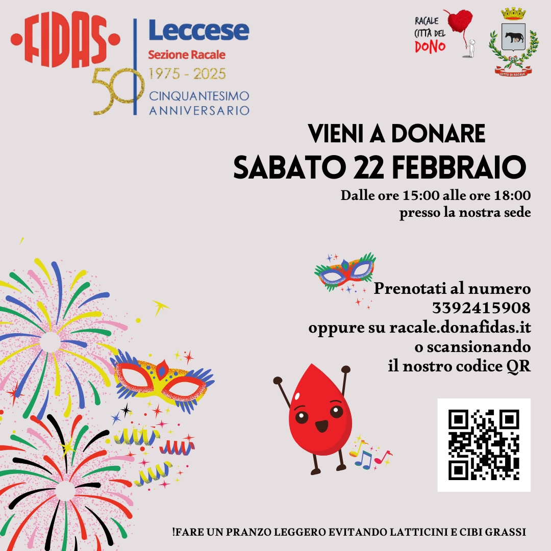 Categorie Donazioni Donazione 22 Febbraio Autore articolo Di FIDAS Racale Data dell'articolo 6 Febbraio 2025 Si dona il sangue Sabato 22 Febbraio dalle ore 15:00 alle ore 18:00 presso la nostra sede Leggi... "Donazione 22 Febbraio"