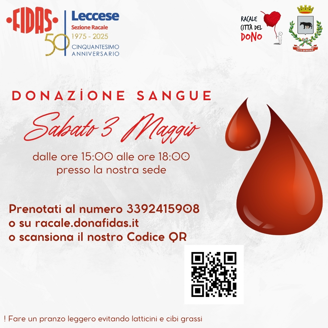 Categorie Donazioni Donazione 3 Maggio Autore articolo Di FIDAS Racale Data dell'articolo 25 Aprile 2025 Si dona il sangue Sabato 3 Maggio dalle ore 15:00 alle ore 18:00 presso la nostra sede Leggi... "Donazione 3 Maggio"
