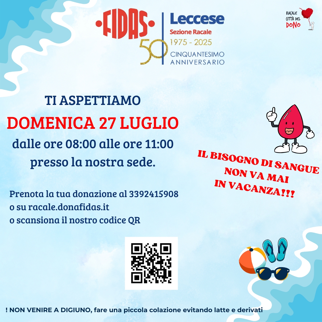 Categorie Donazioni Donazione 10 Agosto Autore articolo Di FIDAS Racale Data dell'articolo 31 Luglio 2025 Si dona il sangue Domenica 10 Agosto dalle ore 08:00 alle ore 11:00 presso la nostra sede Leggi... "Donazione 10 Agosto"