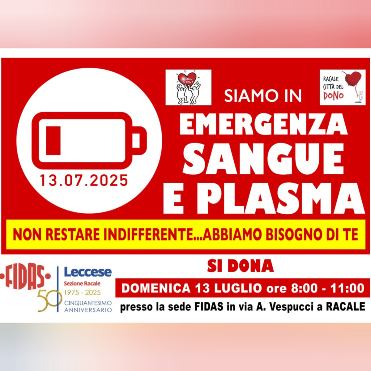 Categorie Donazioni Donazione 13 Luglio Autore articolo Di FIDAS Racale Data dell'articolo 4 Luglio 2025 Si dona il sangue Domenica 13 Luglio dalle ore 08:00 alle ore 11:00 presso la nostra sede Leggi... "Donazione 13 Luglio"