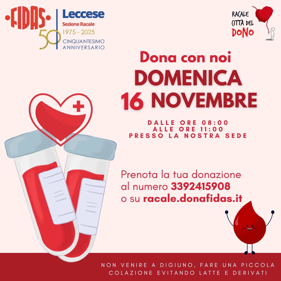 Categorie Donazioni Donazione 16 Novembre Autore articolo Di FIDAS Racale Data dell'articolo 1 Novembre 2025 Si dona il sangue Domenica 16 Novembre dalle ore 08:00 alle ore 11:00 presso la nostra sede. Leggi... "Donazione 16 Novembre"