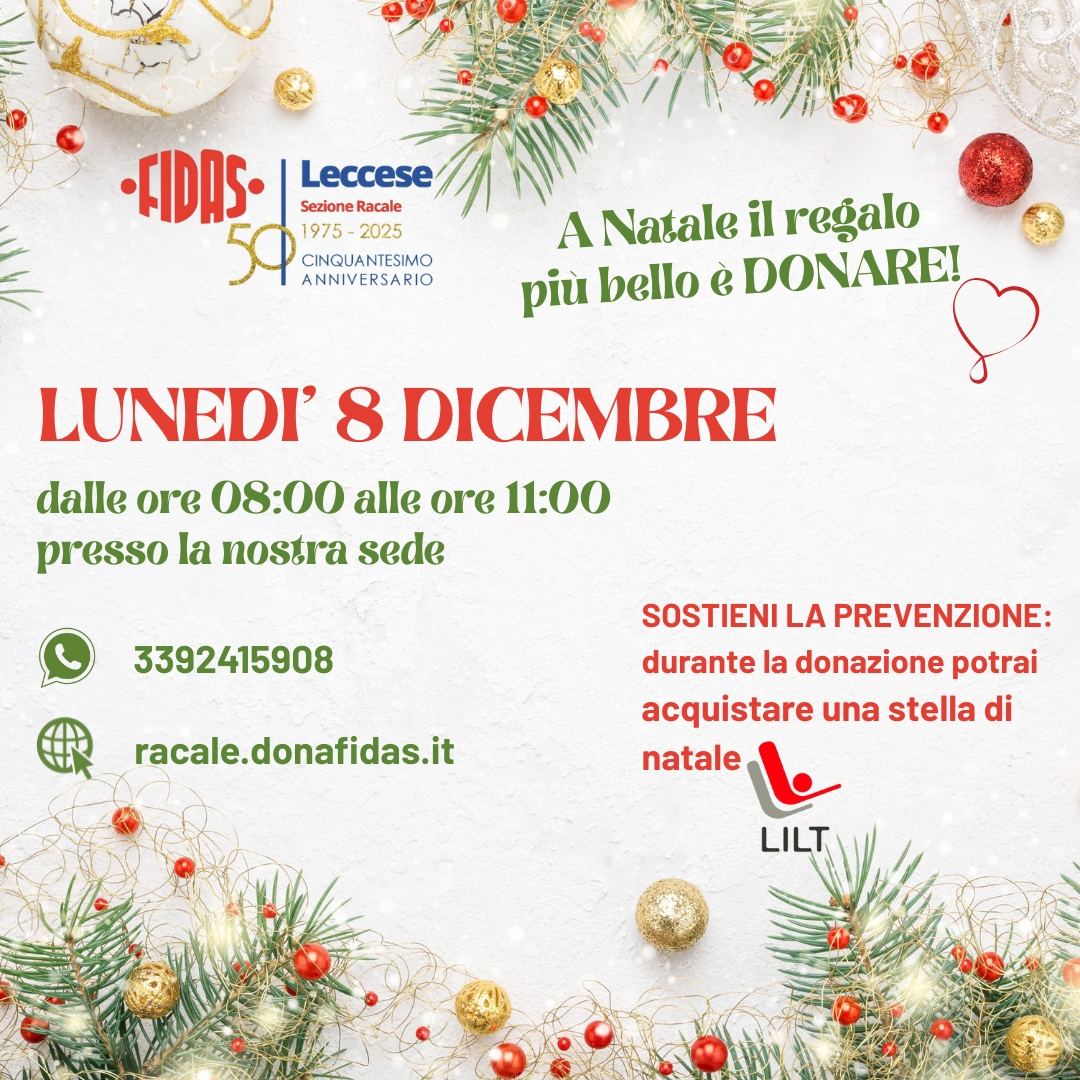 Categorie Donazioni Donazione 8 Dicembre Autore articolo Di FIDAS Racale Data dell'articolo 28 Novembre 2025 Si dona il sangue Lunedi' 8 Dicembre dalle ore 08:00 alle ore 11:00 presso la nostra sede. Leggi... "Donazione 8 Dicembre"