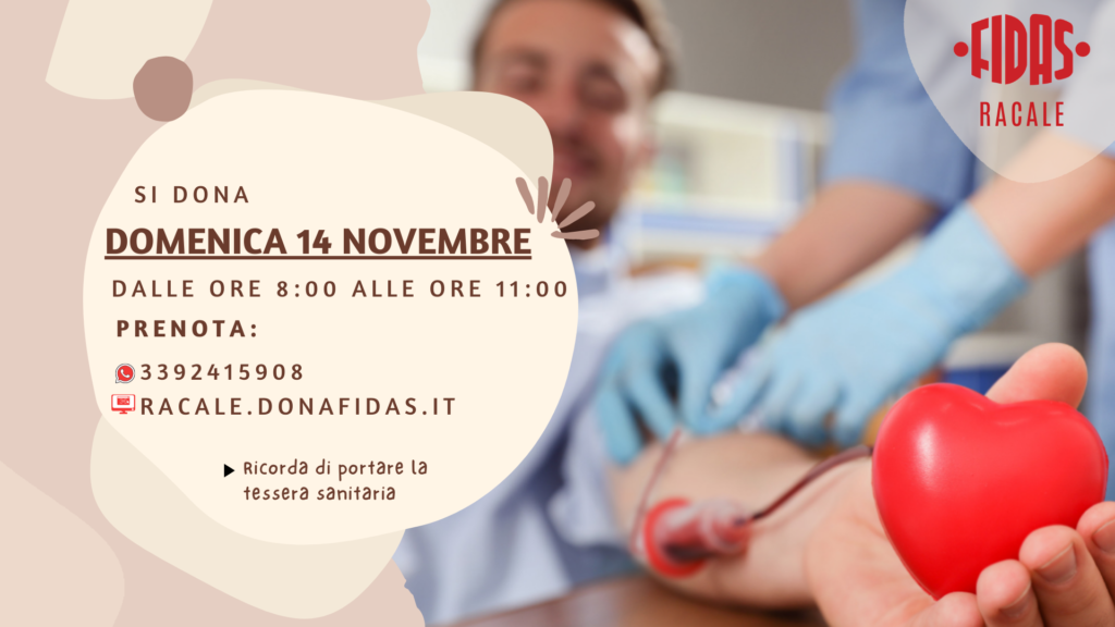 Si dona il sangue domenica 14 novembre dalle ore 8.00 alle ore 11.00 presso la nostra Sede