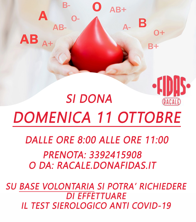 Si dona il sangue domenica 11 ottobre dalle ore 8.00 alle ore 11.00 presso la nostra Sede