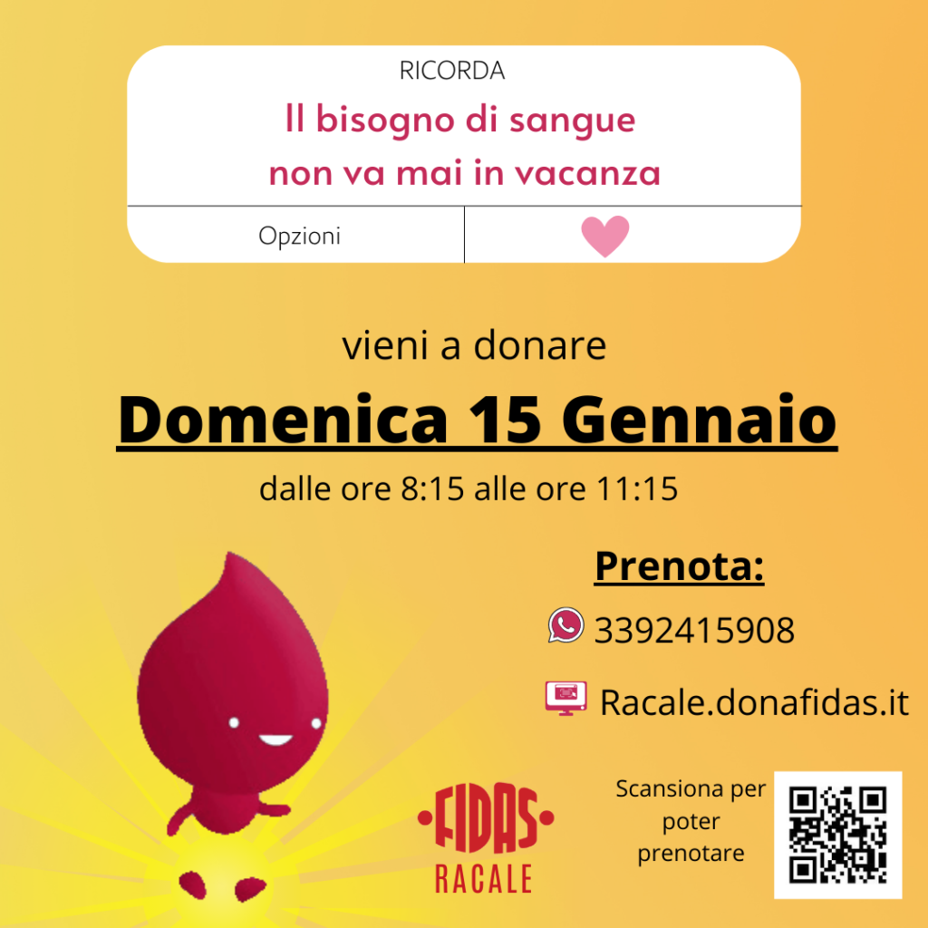 FIDAS Racale ti invita a donare sangue presso la propria sede, sita in Via A. Vespucci, n.3.