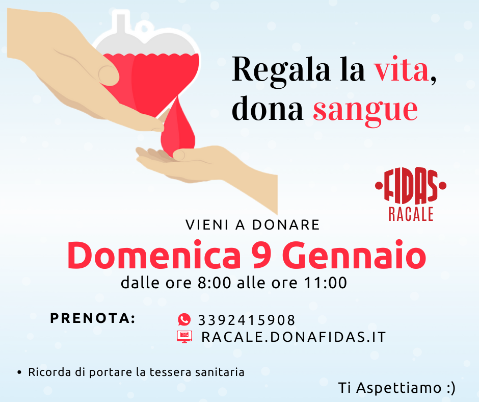 Si dona il sangue Domenica 9 GENNAIO dalle ore 8.00 alle ore 11.00 presso la nostra Sede
